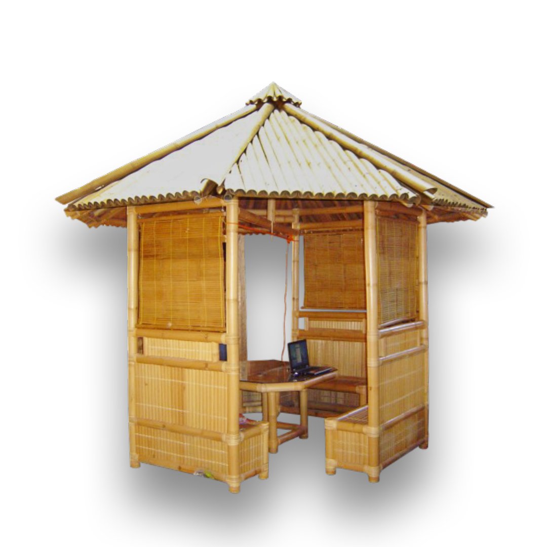 A traditional bamboo gazebo with built-in benches and center table, designed as a cozy outdoor gathering spot. Featuring roll-up bamboo shades and a pitched roof, it provides shaded, airy comfort for relaxing, dining, or working in the garden or patio.